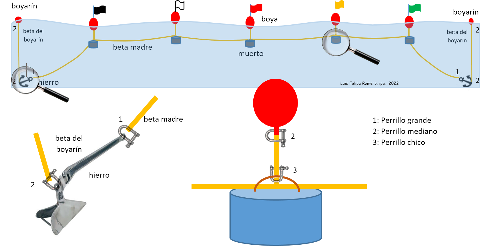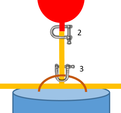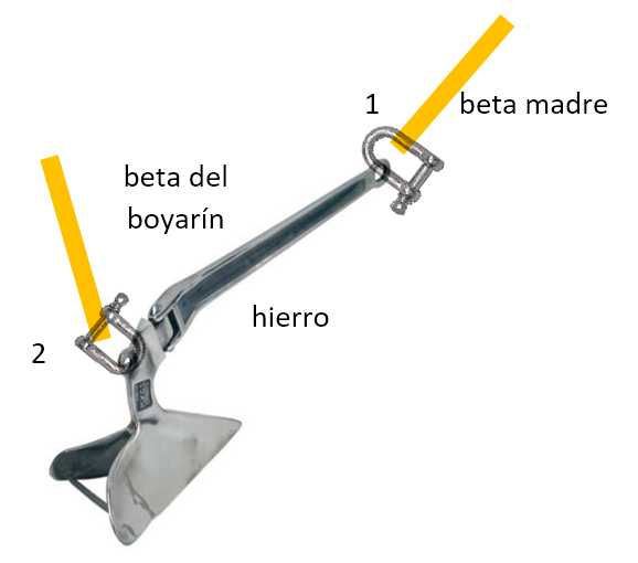 - Se coloca un grillete mediano (2) para unir el hierro (usando la argolla del pico del ancla, pues se va a utilizar para "desanclarla" del fondo) con el otro chicote de la beta de boyarín